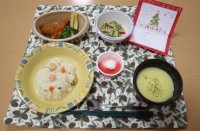 12月24日にクリスマス行事食を行いました。クリスマスをイメージし楽しい雰囲気を感じていただけるような献立をご用意しました。 < 献立 > ・エビピラフ ・フライドチキン、フライドポテト ・彩りサラダ ・クリ...